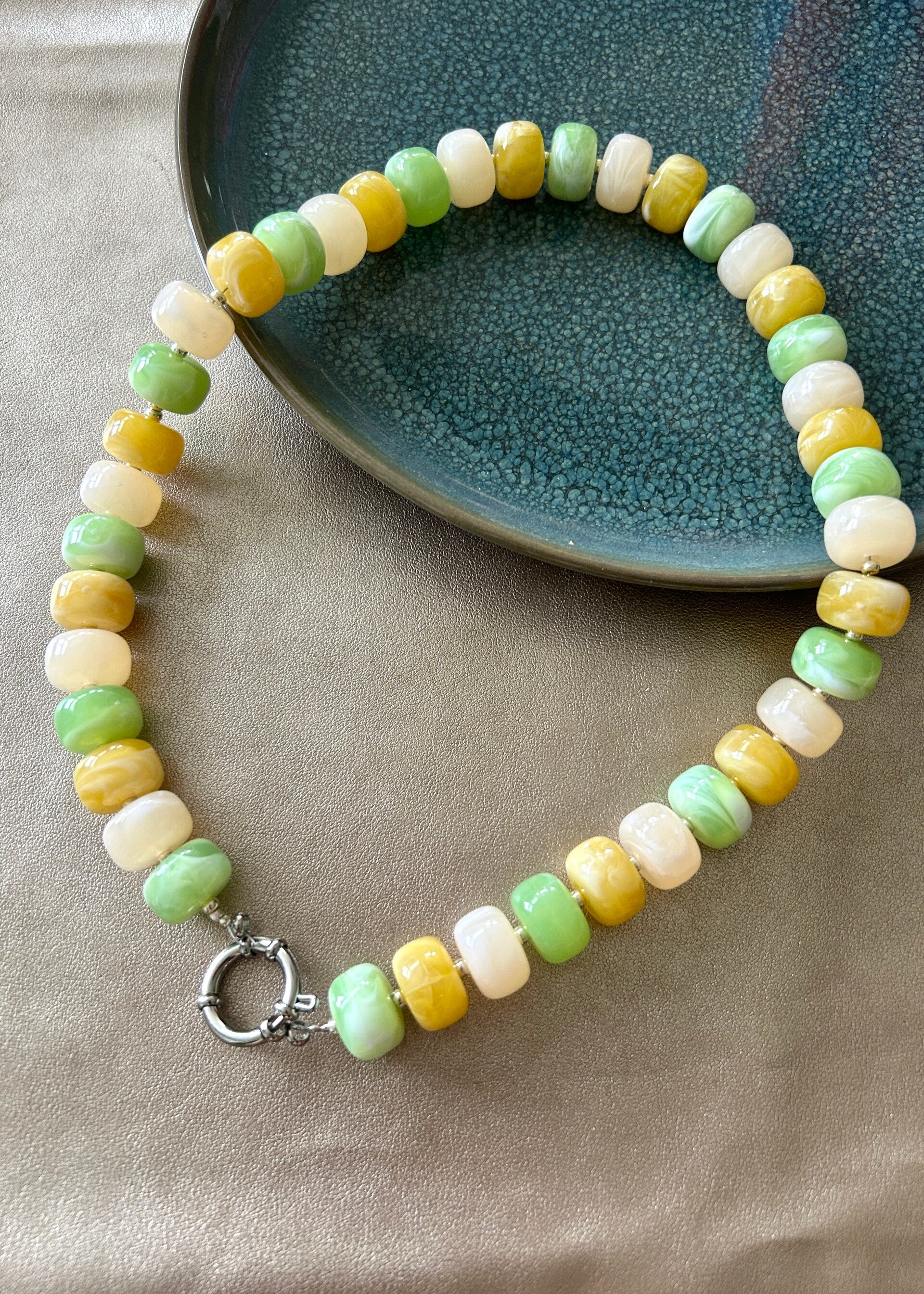 - De kralen zijn gemaakt van acryl (14mm) en miyuki.